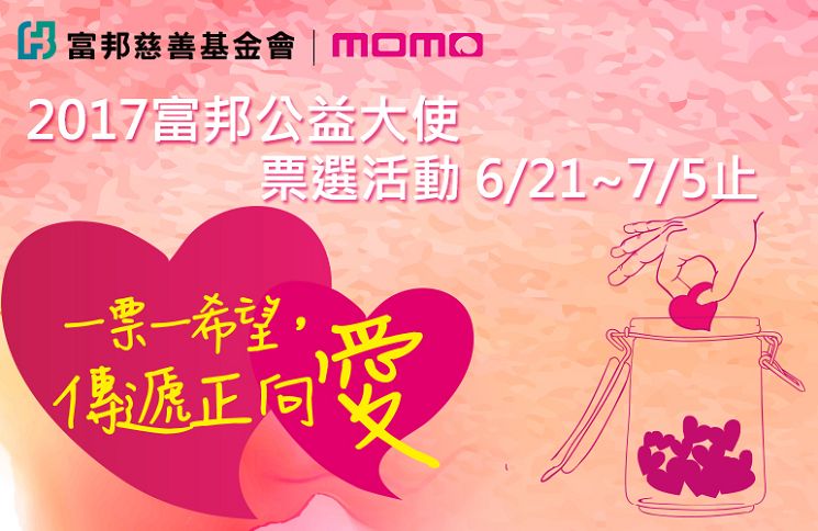 2017富邦公益大使「一票一希望 傳遞正向愛」票選活動(6/21~7/5):http://ambassador.fuboncharity.org.tw/project/index/ALL