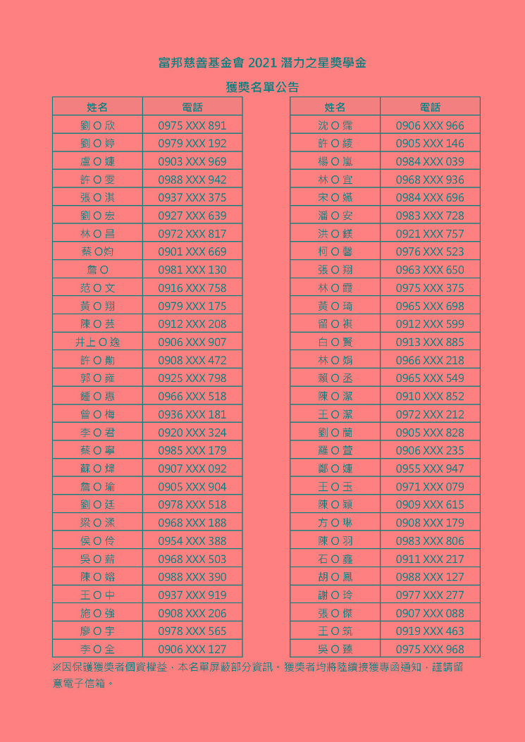 2021「富邦慈善基金會潛力之星獎學金」獲獎名單