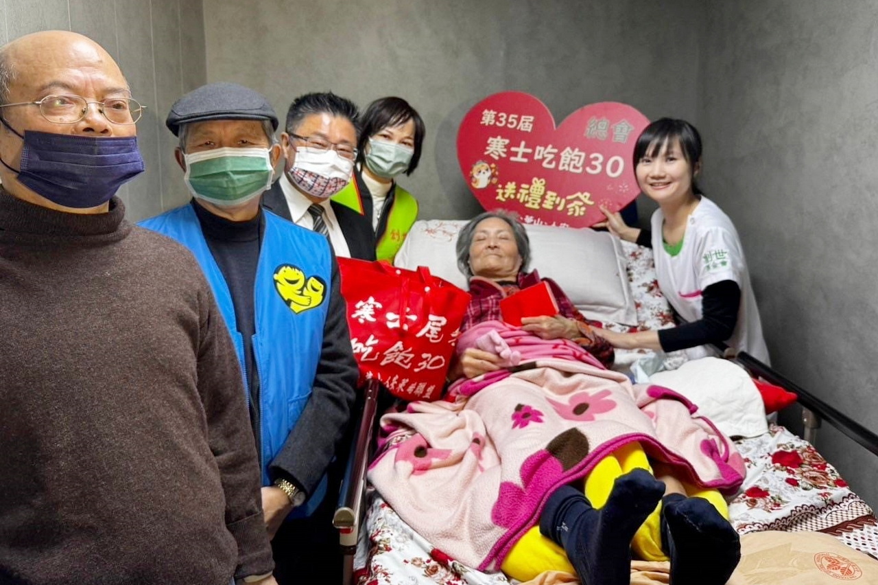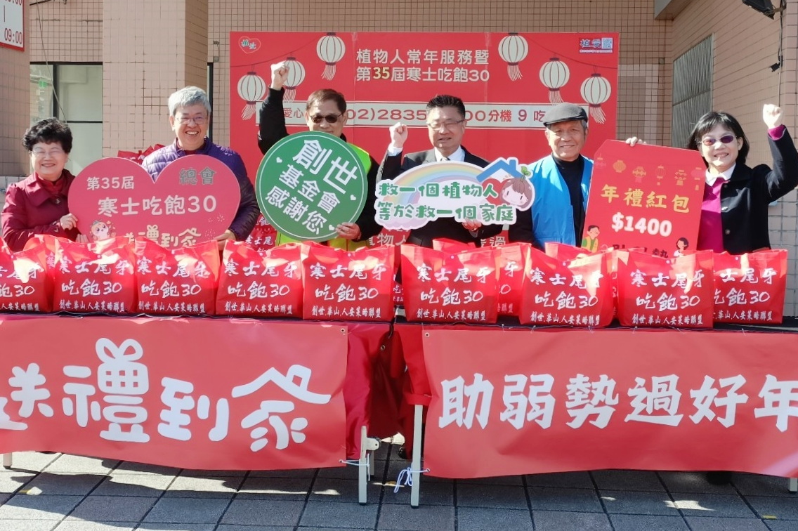 創世基金會多年來致力服務植物人家庭、寒士街友、清寒單親、獨居長輩等弱勢對象,舉辦之「植物人常年服務暨寒士吃飽30」募款活動迄今已屆滿34個年頭,近四年來受疫情、流感及食安議題影響,改以「送禮到家」替代圍爐。富邦集團秉持公益初衷,自2017年起捐助創世基金會,年年不缺席至今已第九年。今(13)日起創世基金會展開「植愛年禮」送禮到家活動,由前副總統陳建仁先生、衛生福利部呂建德次長、臺北市政府社會局鄭文惠副局長與富邦慈善基金會鄭基男董事化身送禮大使,前往植物人家庭贈送關懷年禮及祝福紅包,並貼上吉祥喜氣的春聯,為弱勢家庭打氣,祝福一年平安順利!